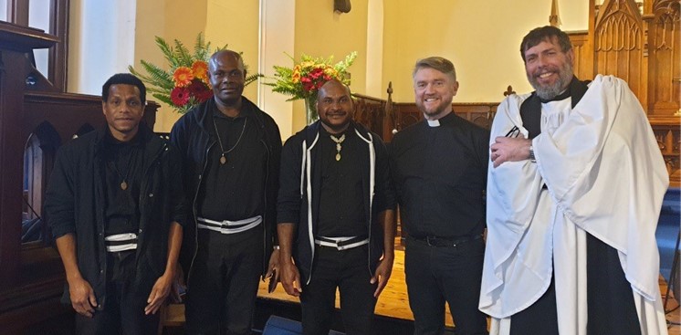 Abaijah, Matthias and Kelliot (from the Melanesian Brotherhood in Shepparton) with Conrad and Rev Jon Cox as Conrad is admitted as an Associate of the Melanesian Brotherhood. Rev Jon Cox is pastor at St Lukes Anglican Church South Melbourne and his church sponsors Conrad’s work in Melanesia.